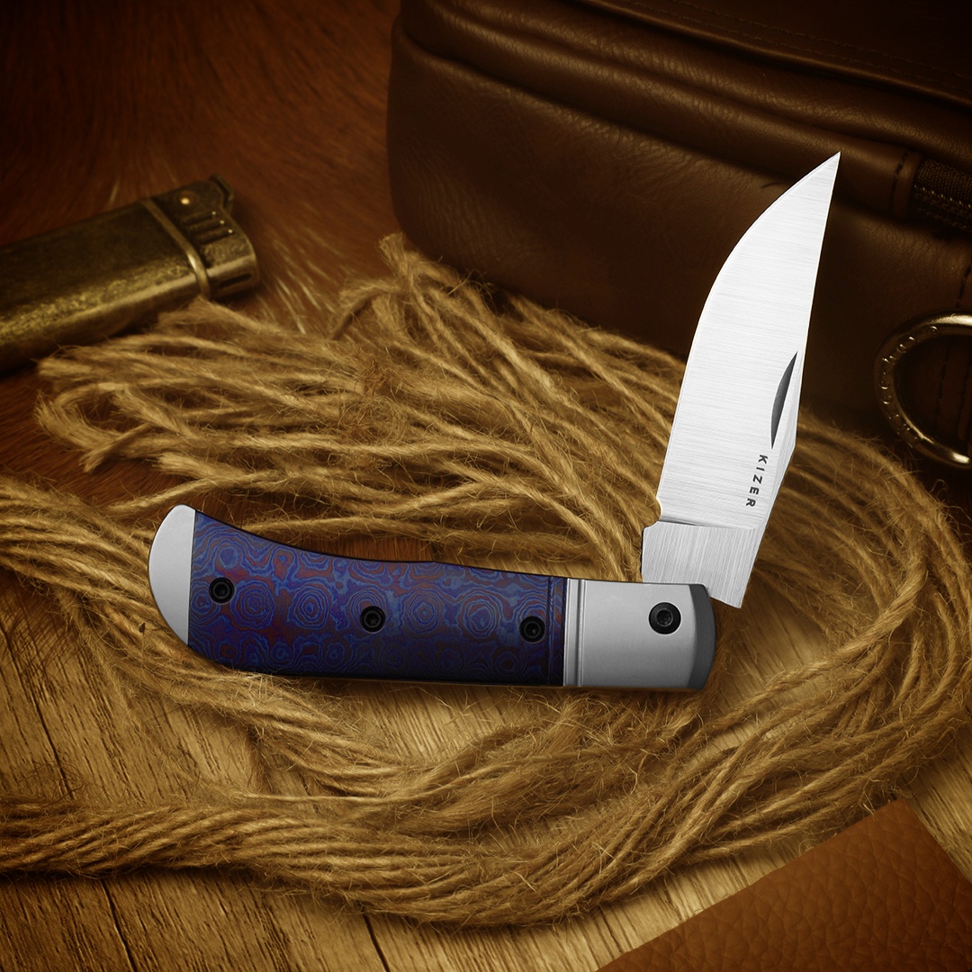 Das Kizer Trestle setzt auf die hochwertige und optisch ansprechende Materialkombination aus Titan und Micarta. Titan verleiht dem Griff Stabilität und Langlebigkeit, während Micarta für eine angenehme Haptik und sicheren Halt sorgt. Das Zusammenspiel schafft nicht nur eine elegante Optik in Silber und Braun, sondern auch ein hohes Maß an Alltagstauglichkeit.