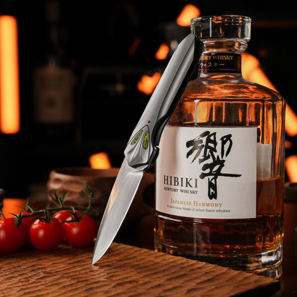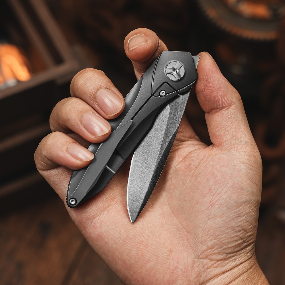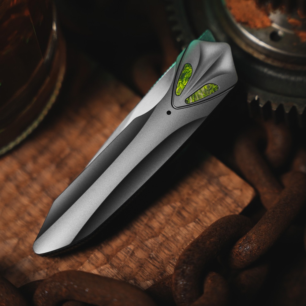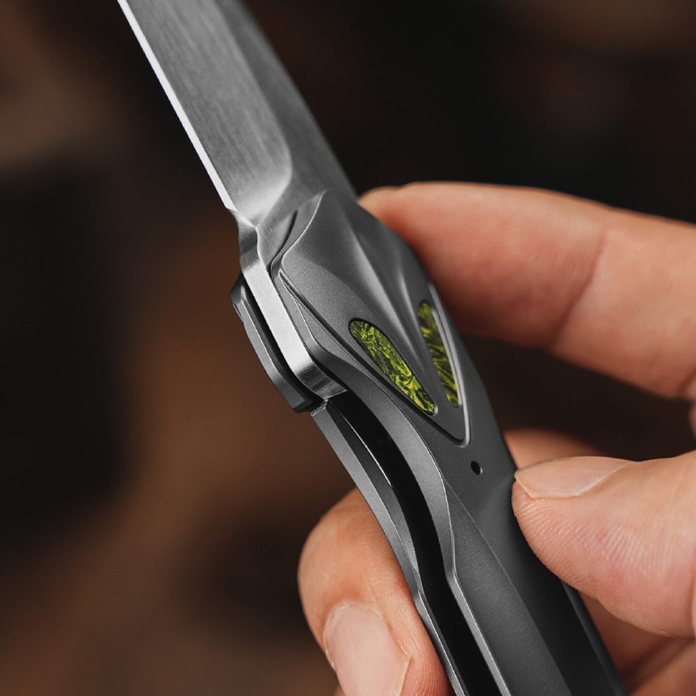 Das auffälligste Merkmal des Silver Fox ist zweifellos das Gehäuse. LAIR setzt hier auf hochwertiges GR5-Titan (Aerospace Grade), das für extreme Robustheit sorgt und das Messer mit einem Gewicht von 79,8 g in der leichten Gewichtsklasse für EDC-Folder positioniert. Der Clou sind die Inlays: Das verwendete „Green Forged Carbon“ verleiht dem Griff eine organische Struktur, die je nach Lichteinfall unterschiedlich schimmert. Diese optische Tiefe macht das SFX-1 zu einem markanten „Statement-Piece“.