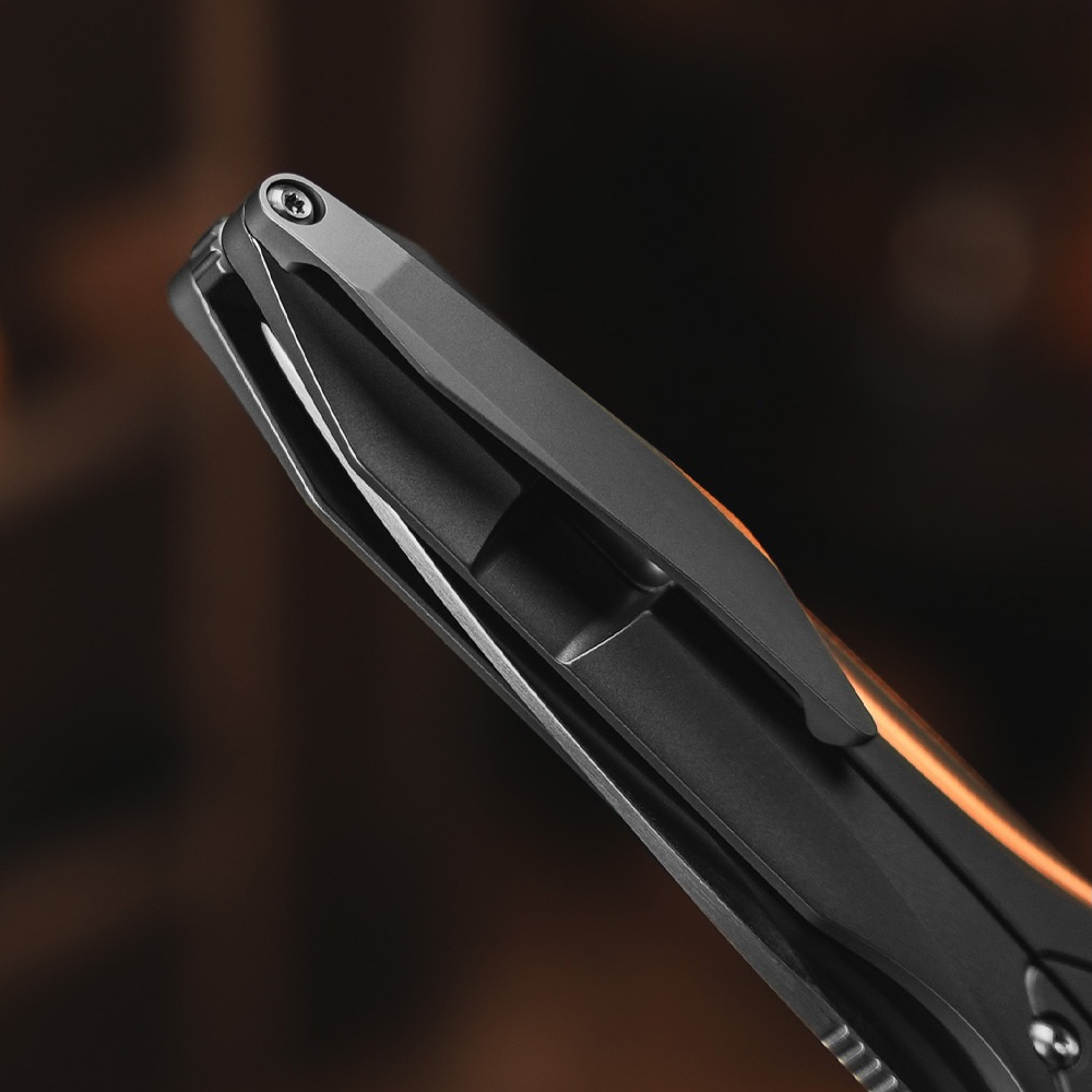 Bei einer Gesamtlänge von 175 mm setzt das Design auf eine schlanke Linienführung. Die Mechanik basiert auf einem Front-Flipper, der im geschlossenen Zustand die Silhouette des Messers nicht unterbricht und ein einhändiges Öffnen ermöglicht. Die Verriegelung übernimmt ein Titanium Frame Lock, der direkt in die Griffschale integriert ist. Diese Bauweise reduziert die Anzahl der Bauteile und sorgt für einen bündigen Verschluss der Klinge. Mit einer Griffdicke von lediglich 12 mm ist das SFX-1 zudem auf ein flaches Profil für das tägliche Tragen ausgelegt.