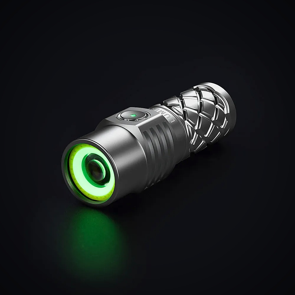 Ein optisches Highlight für Sammler sind die Turbo Glow Elemente. Lumintop hat sowohl einen Leuchtring an der Bezel (Kopf) als auch Leuchtstäbe an der Tailcap (Ende) integriert. Dieses Material lädt sich durch Licht auf und ermöglicht es uns, die Lampe auch in absoluter Dunkelheit sofort zu finden.