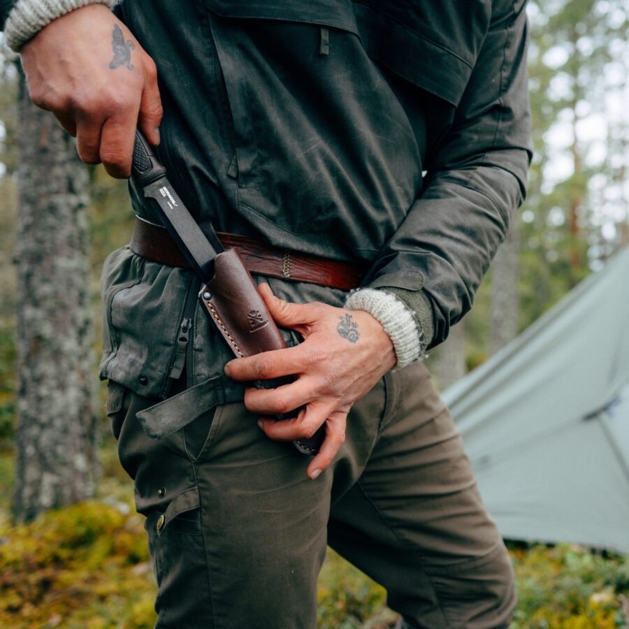 Neu ist die braune Lederscheide, die in beiden Varianten beiliegt. Sie besteht aus vegetabil gegerbtem, europäischem Leder, ist LWG zertifiziert und deutlich hochwertiger verarbeitet als frühere Morakniv Scheiden. Das Design wirkt aufgeräumt, skandinavisch schlicht, aber funktional. Ein praktischer Gürtelhalter sorgt für sicheren Sitz, ohne beim Gehen zu stören.