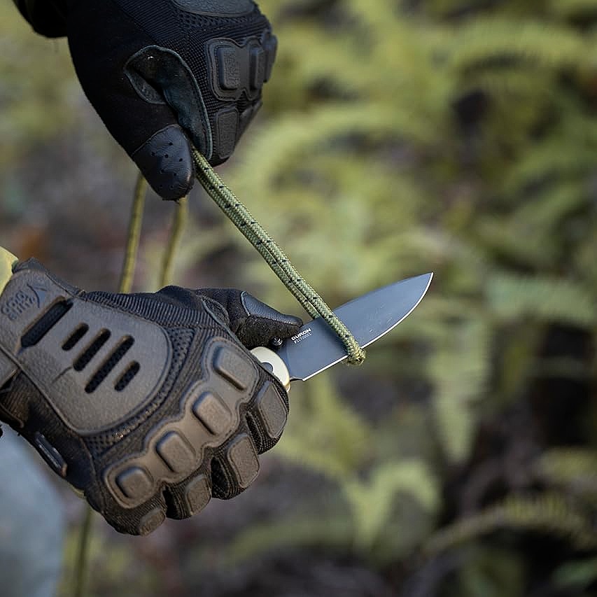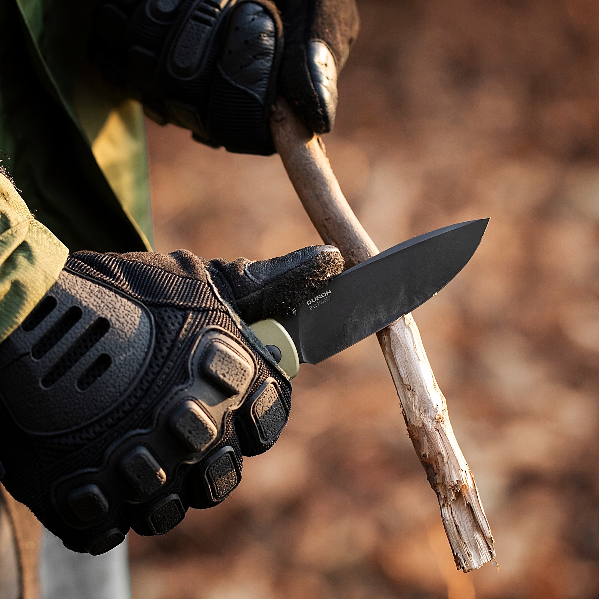Im Alltag zeigt sich die Klinge vielseitig: Pakete öffnen, Lebensmittel schneiden oder kleine Arbeiten im Outdoor-Bereich – das Duron deckt diese Szenarien zuverlässig ab. Dank des moderaten Klingenprofils bleibt es schnitthaltig, lässt sich aber auch ohne großen Aufwand nachschärfen. Das Jimping am Klingenrücken erhöht die Kontrolle, wenn beim Schneiden zusätzlicher Druck nötig ist.