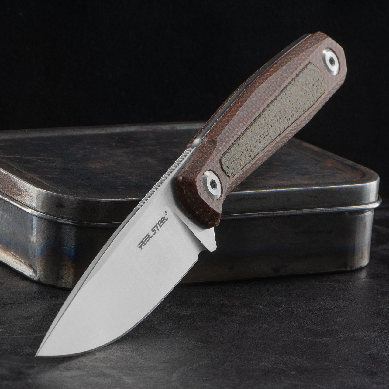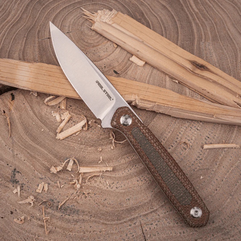 In der hier betrachteten Version besteht der Griff aus braunem Micarta mit einem grünlichen Inlay, das Real Steel präzise an die Konturen des Stahls anpasst. Das Material fühlt sich warm und griffig an, besonders bei Nässe, und passt gut zur eher unaufgeregten Formsprache des Messers.