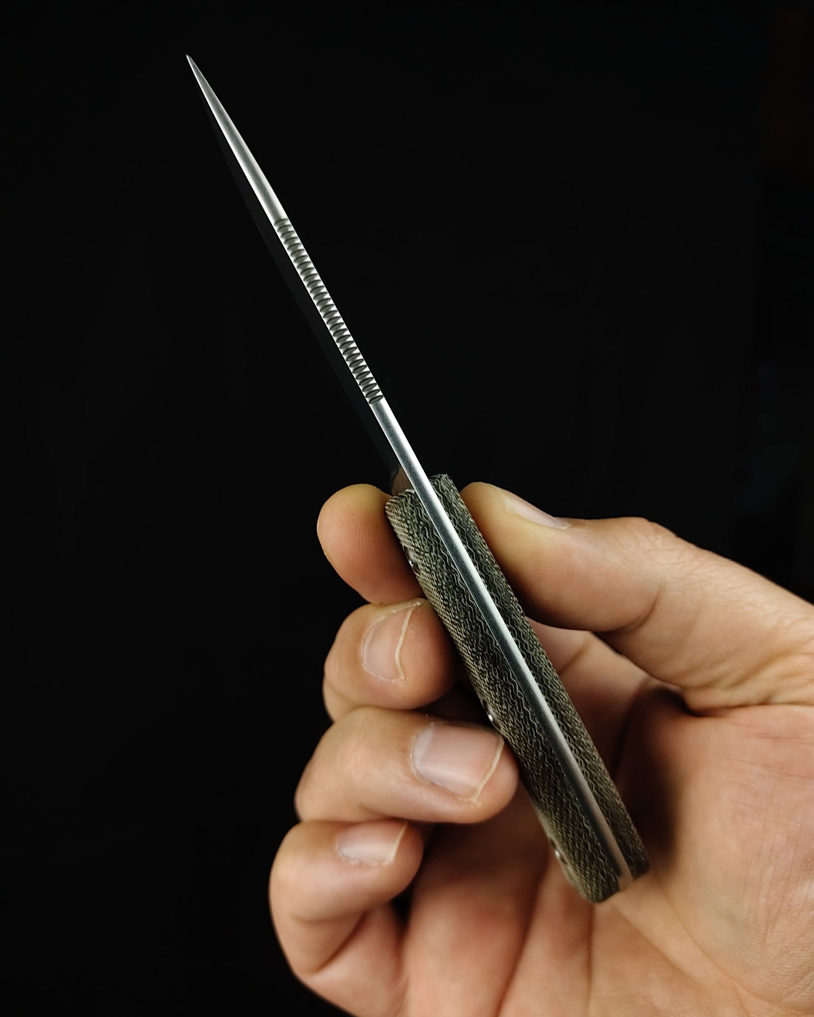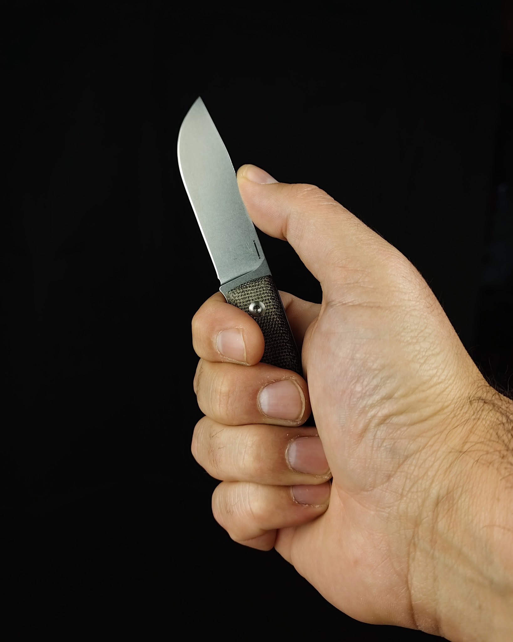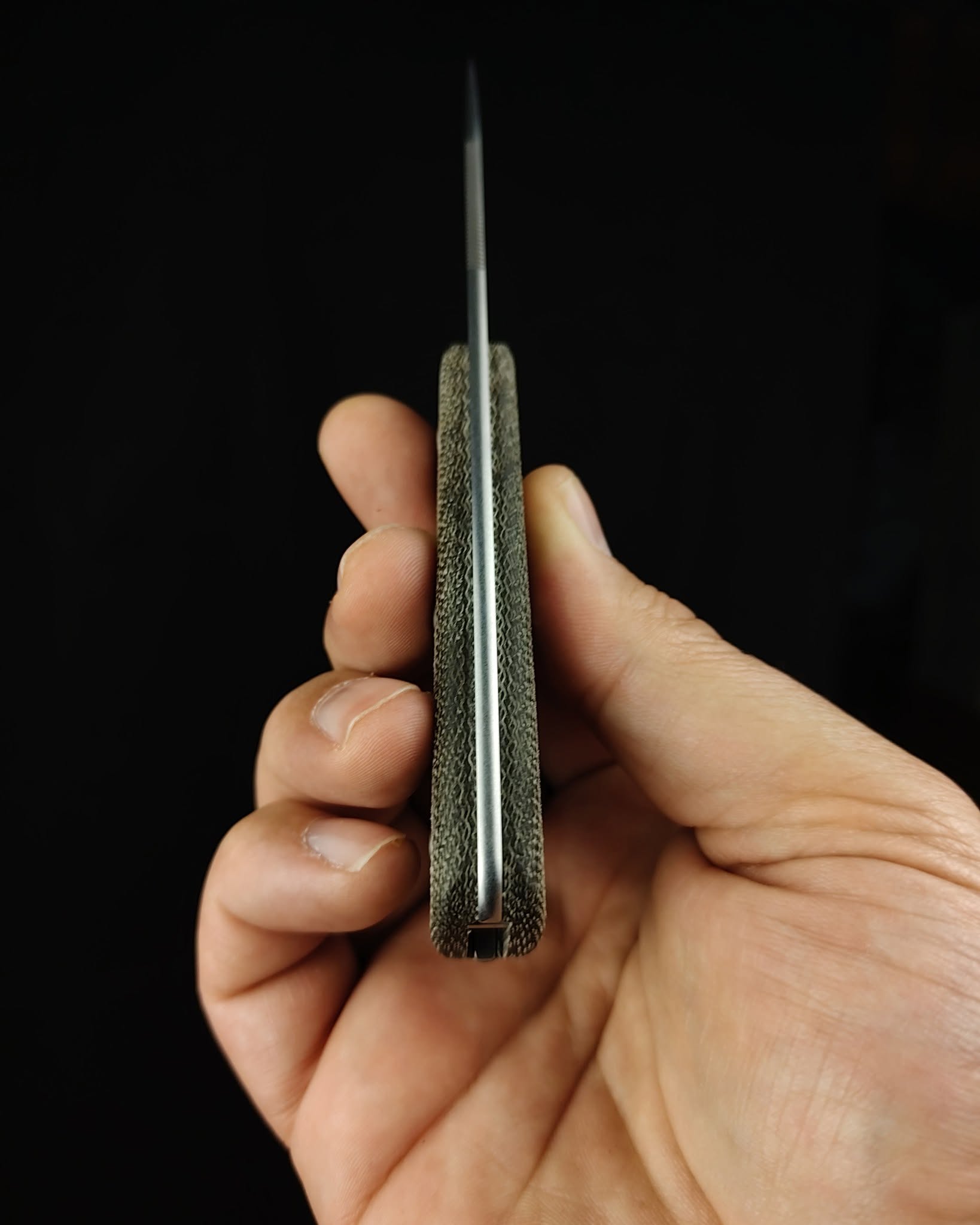 Besonders ins Auge fällt mir die Version mit Griffschalen aus Green Canvas Micarta. Dieses Material genießt in der EDC-Community Kultstatus, da es extrem widerstandsfähig ist und mit der Zeit eine individuelle Patina entwickelt, die jedes Messer zu einem persönlichen Unikat macht. Zudem bietet Micarta auch bei Nässe einen sicheren Grip und fühlt sich haptisch deutlich „wärmer“ und organischer an als technisches G10 oder kühles Metall. Mit einem Gewicht von gerade einmal 55 Gramm (ohne Scheide) ist das Buster ein echtes Federgewicht.