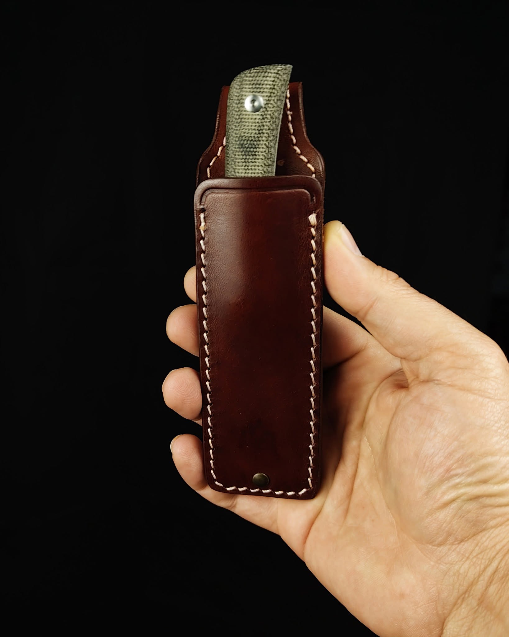 Ein Detail, das das Buster deutlich von der Masse abhebt, ist die innovative Smart Mag Lederscheide. Anstatt auf klassische Druckknöpfe oder fummelige Kydex-Lösungen zu setzen, nutzt diese Scheide einen cleveren Magnetverschluss. Das Messer gleitet fast von selbst in die richtige Position, sitzt bombenfest und lässt sich dennoch absolut lautlos und blitzschnell mit einer Hand ziehen. Die braune Lederoptik harmoniert perfekt mit dem grünen Micarta und atmet das Flair traditioneller italienischer Handwerkskunst.