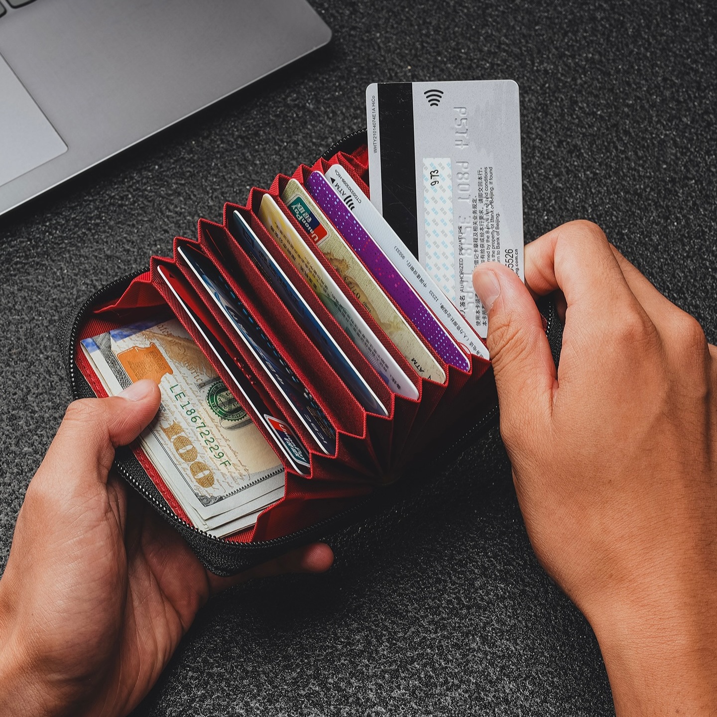Das Kernfeature ist das Akkordeon-Innenleben mit elf einzelnen Kartenfächern, die für Kreditkarten, Ausweise, Kundenkarten oder kleine Notfall-Datenkarten ausgelegt sind. Durch die Fächerstruktur lassen sich Karten sortiert nach Kategorie oder Nutzungshäufigkeit organisieren, was das Suchen im Alltag deutlich beschleunigt. Der Akkordeon-Aufbau sorgt dafür, dass sich der Inhalt beim Öffnen auffächert und schnell einsehbar wird.