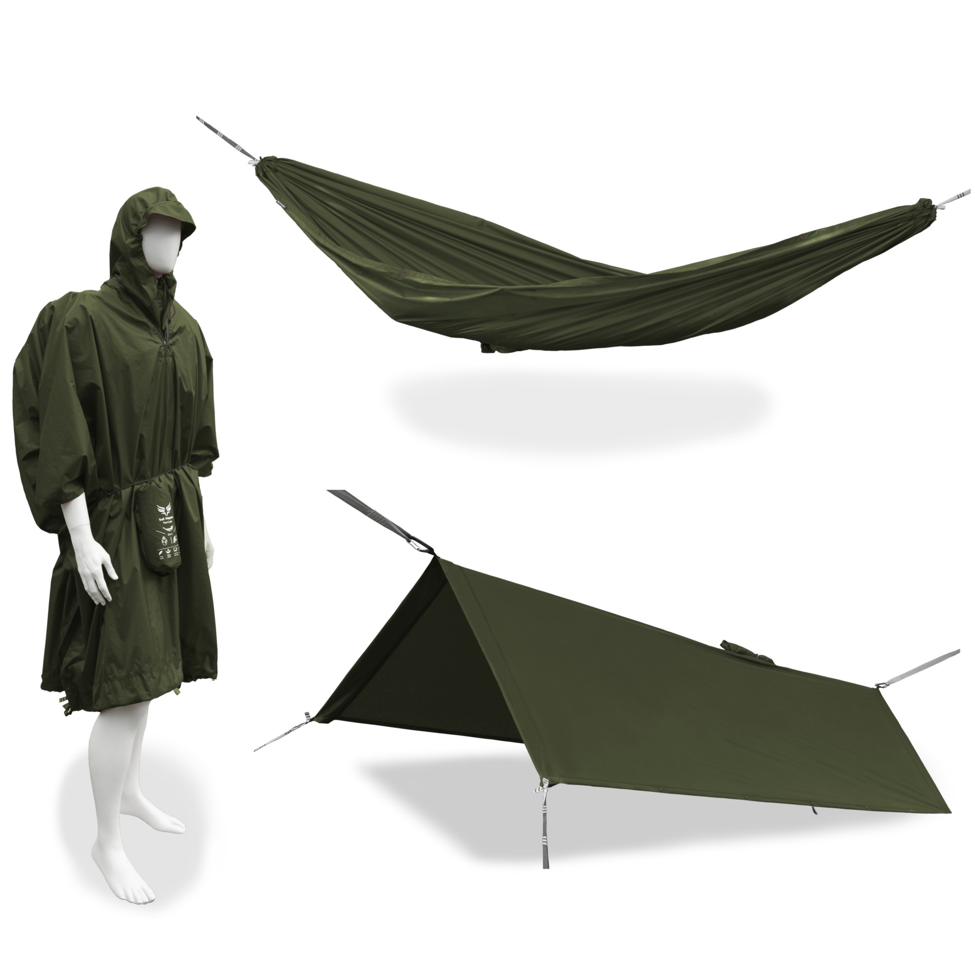 Das Trail Hoppers 3-in-1 Cape vereint Poncho, Hängematte und Tarp in einem einzigen Produkt. Mit geringem Gewicht, robusten Materialien und schneller Umwandlungsmöglichkeit ist es ein vielseitiges Tool für Outdoor-Fans. Ob als Wetterschutz, bequeme Hängematte oder flexibles Shelter, das Cape deckt unterschiedliche Anforderungen ab und ermöglicht es flexibel zu bleiben. Das 3-in-1 Cape gibt es in 4 verschiedenen Farben. Neben dem hier gezeigten Kaki Green kann man im offiziellen Trail Hoppers Shop auch die Farbvarianten Midnight Blue, Sunset Yellow und Pepper Red auswählen.