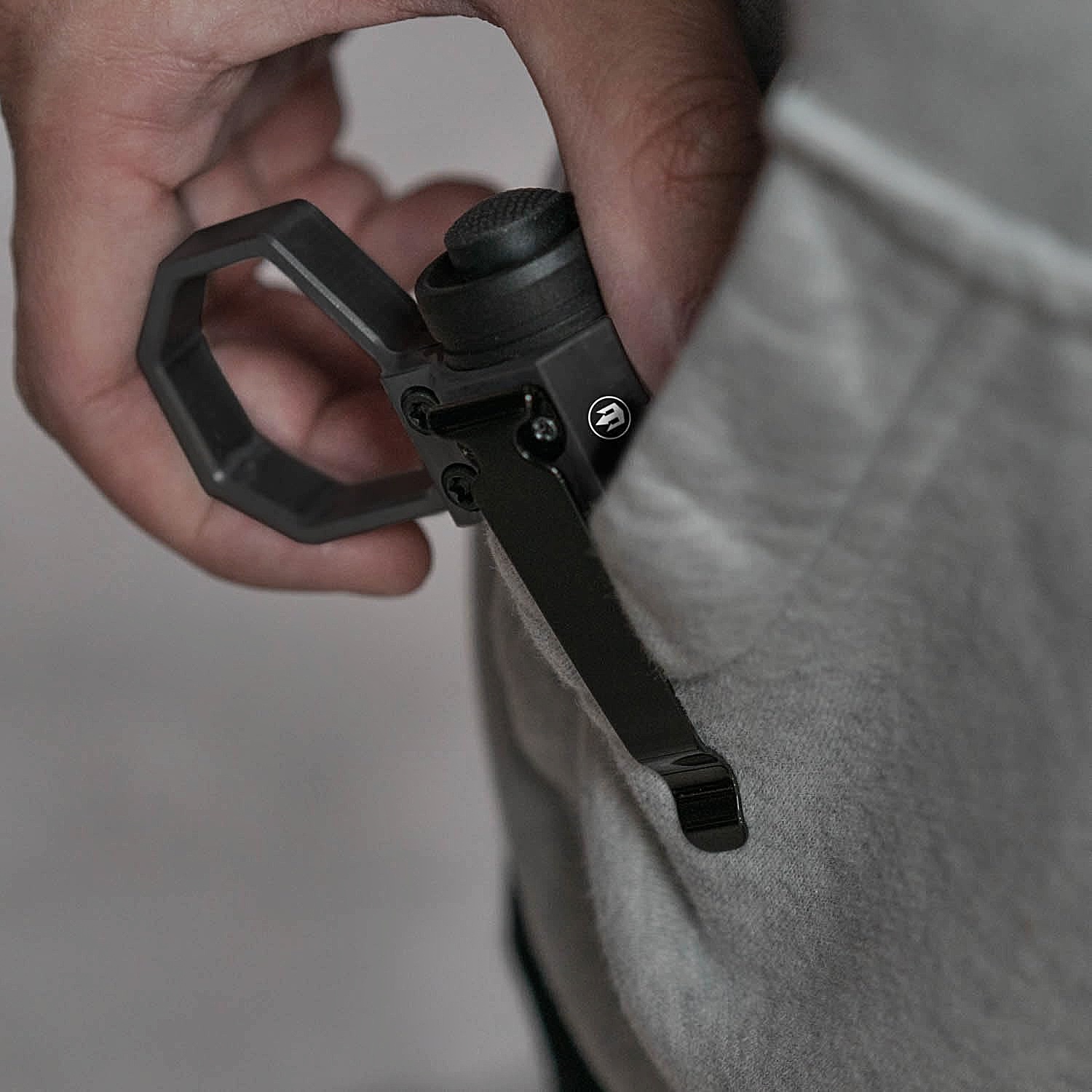 Neben der robusten Schlaufe sorgt ein abnehmbarer Taschenclip für flexible Befestigungsmöglichkeiten an Gürtel, Tasche oder Rucksack, sodass die Lampe stets griffbereit ist, ohne zu stören. Der Clip sitzt direkt auf dem Ring, der mit kleinen Innensechskantschrauben fest am Lampengehäuse verschraubt wird.