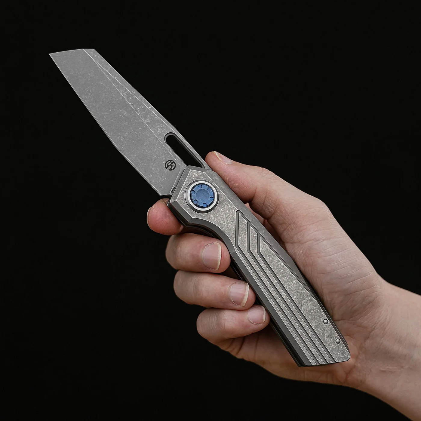 Prägend für das Handgefühl ist der 117,63 mm lange Griff aus 3D-gefrästem Titan. Seine skelettartige Struktur verleiht dem Messer eine beinahe organische Anmutung, ohne die funktionale Klarheit aus den Augen zu verlieren.